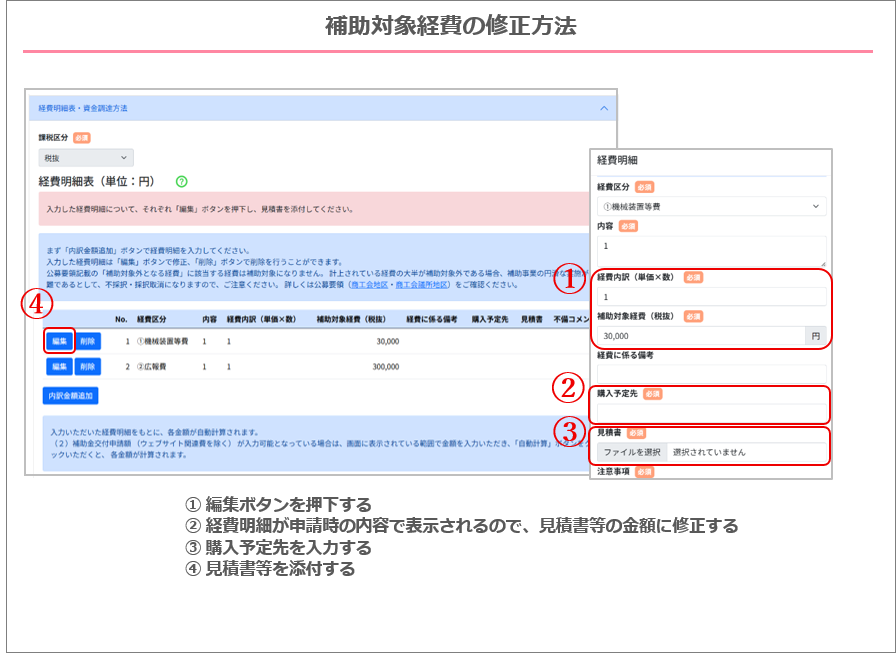 取得した見積書等の金額が、経費明細表の補助対象経費金額と異なる場合には、経費明細表を修正し、再提出をお願いします。