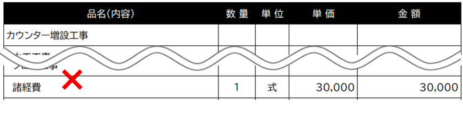 - 「一式」「等」「他」などではなく、品名や数量が具体的に記載されている必要があります。