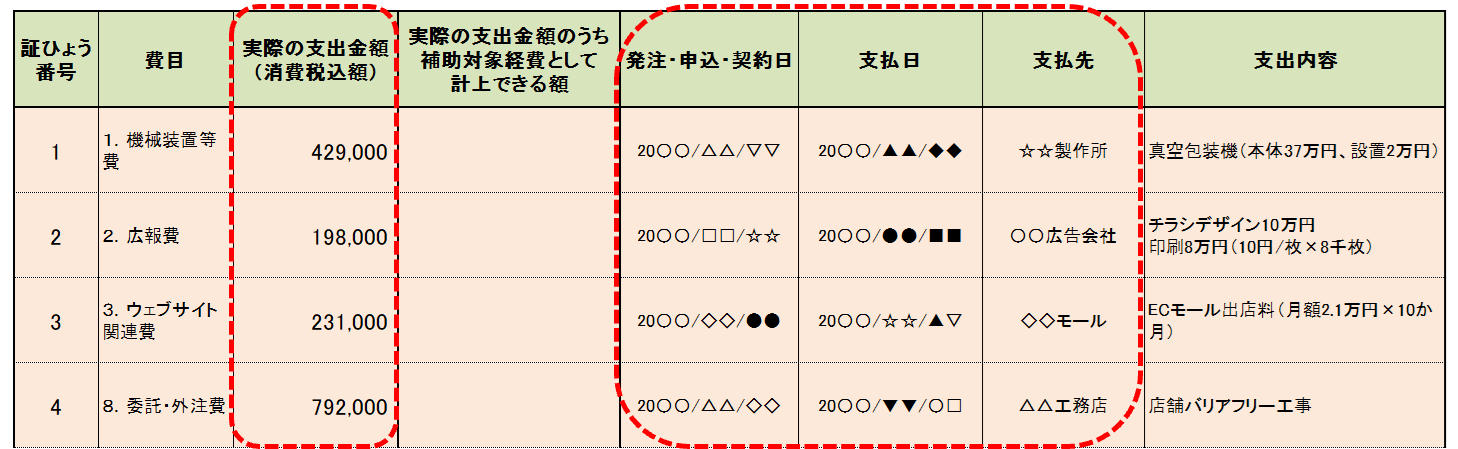 STEP1で整理した経費の順(証ひょう番号順)に、「費目」「実際の支出金額(消費税込額)」「発注・申込・契約日」