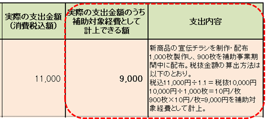 チラシを1,000枚作成したが、補助事業期間中に100枚を配布できなかったケース(900枚が補助対象)