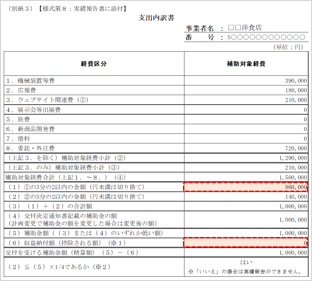 - 「2.支出内訳書(様式第8別紙3)(3)」へ戻り、支出内訳書の作成を完成させます。