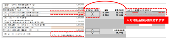 - 「(1)③の3分の2以内の金額」を入力します。入力欄右側に表示される入力可能金額(自動計算)をご確認ください。 <参考3>「(1)③の3分の2以内の金額」の入力例