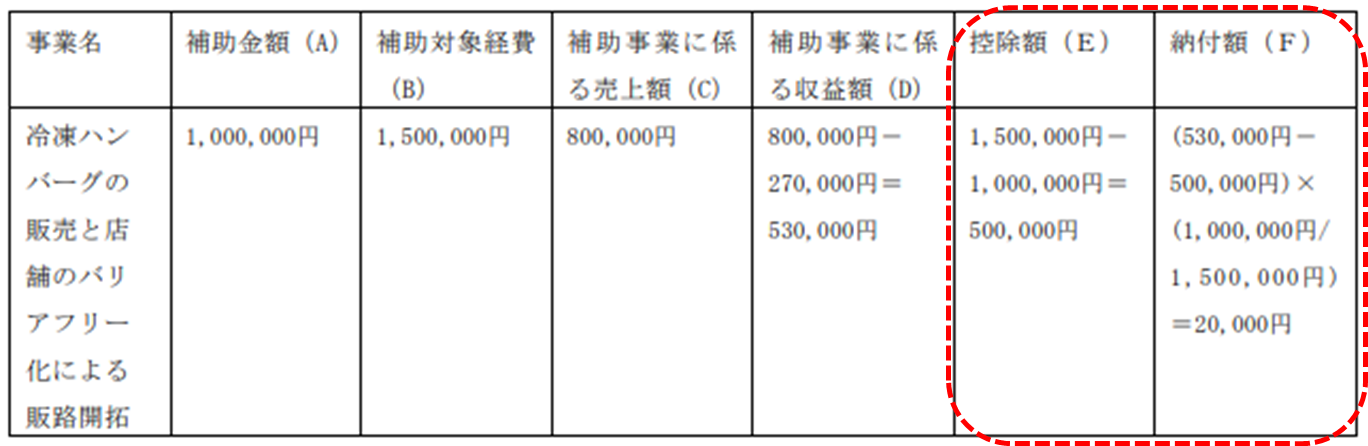 「納付額(F)」=(「補助事業に係る収益額(D)」-「控除額(E)」)
