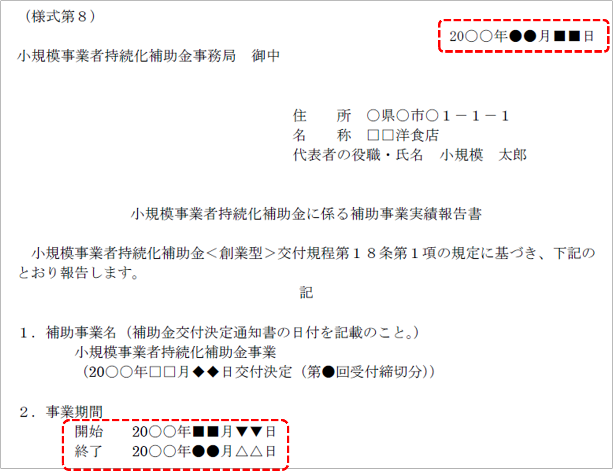 ・「報告日」…終了日から30日以内または実績報告書の最終提出期限のいずれか早い日 - 「(1)事業者名」「(2)事業名」を入力します。