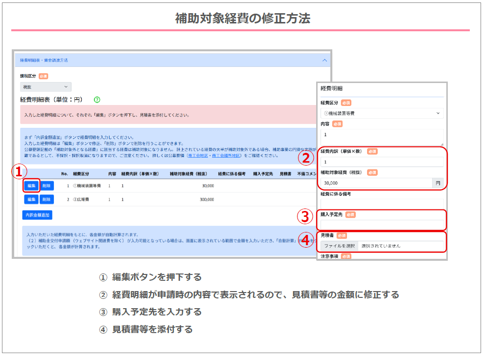 取得した見積書等の金額が、経費明細表の補助対象経費金額と異なる場合には、経費明細表を修正し、再提出をお願いします。